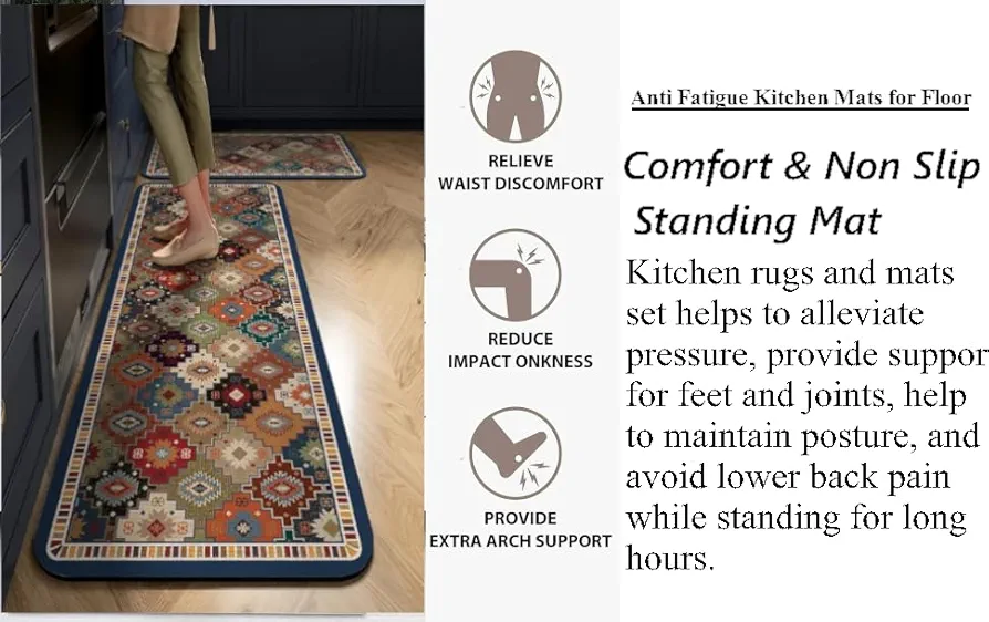 Set of 2 multicolour memory foam kitchen mats. Waterproof, stain-resistant, non-slip, foldable, and easy to clean ? perfect for kitchens, bathrooms, and laundry areas.