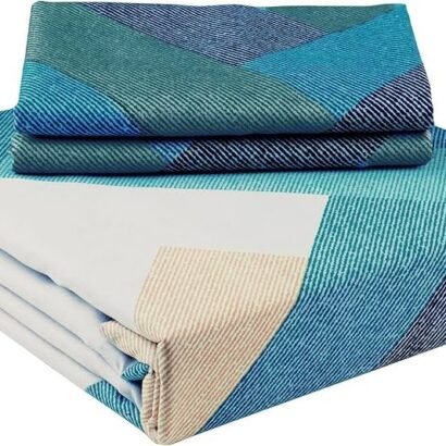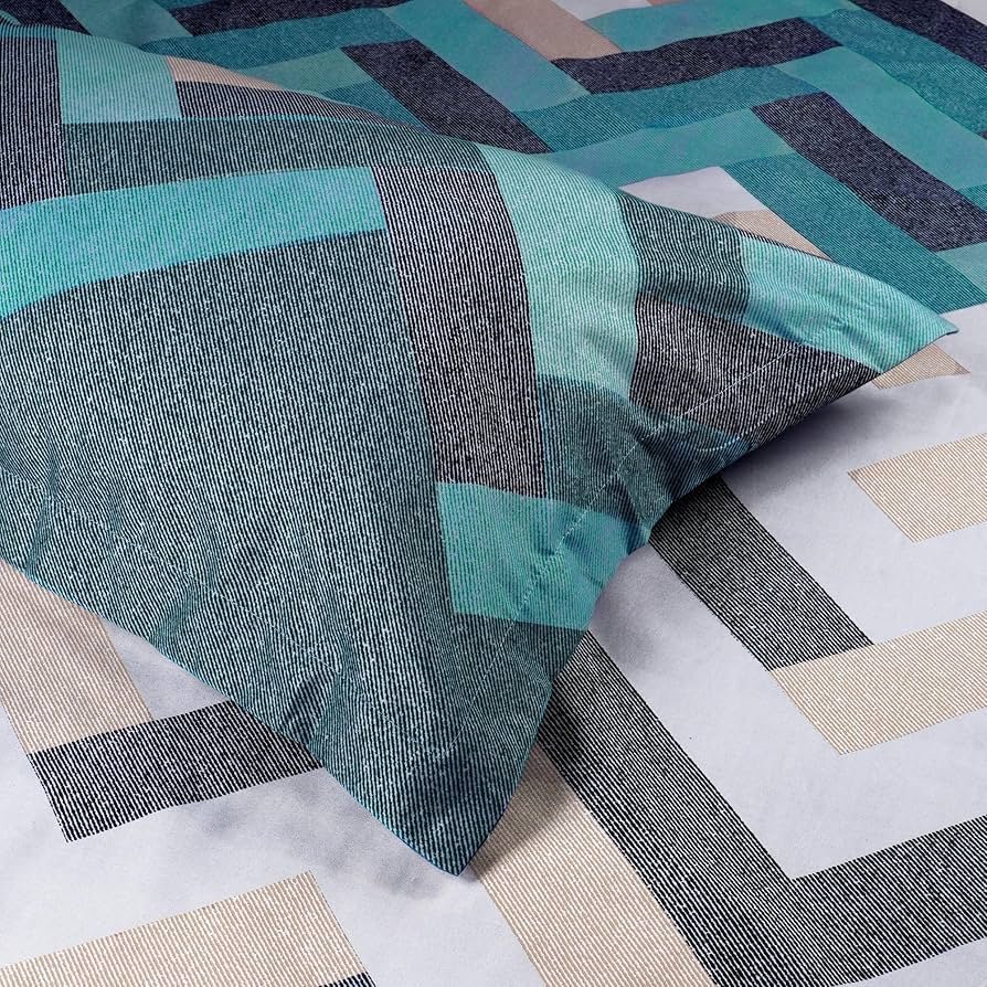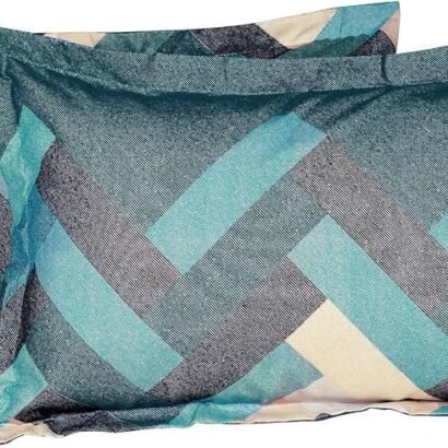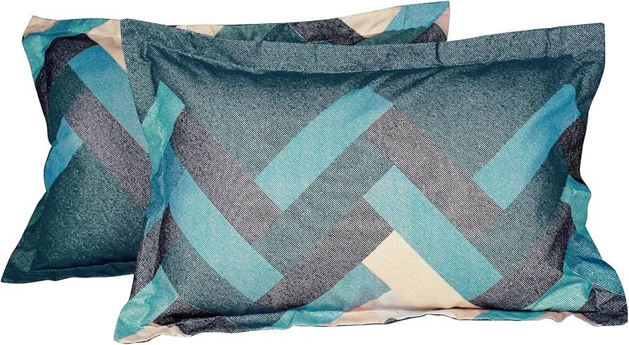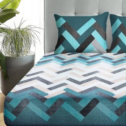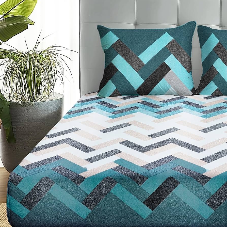- Package Contains : 1 Double Bed Bedsheet with 2 Pillow Covers, Bedsheet Size : 225 X 250 cm, Pillow Cover Size : 46 cm X 69 cm. Color : Cyan Blue & White, Pattern : Geometric. Perfect for everyday use and special occasions, this queen size bed sheet ensures a restful night’s sleep while enhancing the aesthetic of your bedroom. Designed to fit queen-size beds, it also works as a king-size bedsheet, offering versatility.