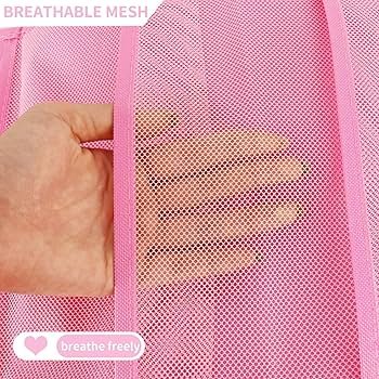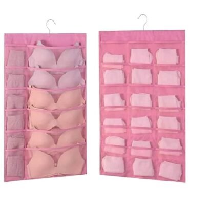 Double-sided 30-pocket hanging organizer in rose pink for underwear, bras, socks, and small clothing items. Foldable, lightweight, and wall-mountable for space-saving closet organization.