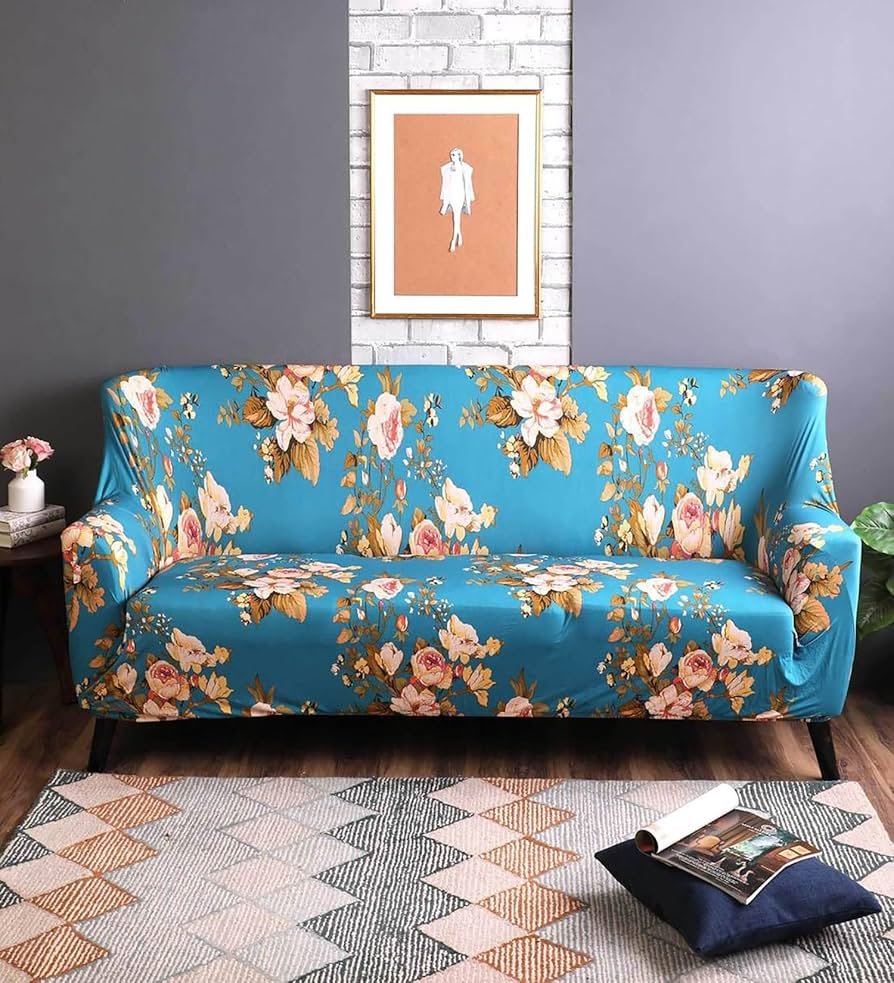 Blue Flower Polyester Sofa Cover – Stretchable, universal 3+1+1 seater fit, protects against spills and pet hair. Elegant floral design. Rs. 500 inclusive of taxes.