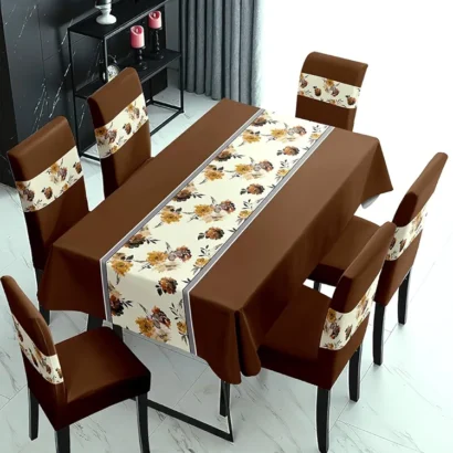 Brown PVC dining table cover with 6 stretchable chair covers. Waterproof, dust- and oil-resistant, offering full protection for your dining furniture.