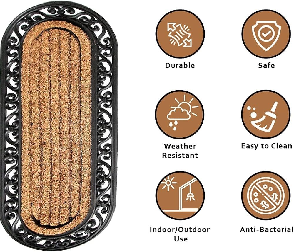 - EMBRACE THE STRENGTH OF COIR BACKED BY RUBBER: Doormat is manufactured using 100% coconut coir, a naturally occurring fibre used worldwide for its remarkable durability and scrapping properties. The back and side frame of the floor mat comes embedded with Natural Rubber, a material with excellent weight-bearing capacity. The coir insert in the rubber frame can withstand the harsh climate and physical conditions, offering you a mat that will last longer without losing its look and build.