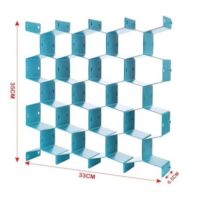Organize your drawers efficiently with this Plastic Honeycomb Underwear and Socks Organizer. Featuring 38 compartments and 16 adjustable straps, this organizer can be customized to fit any drawer size. Made from durable blue plastic with a polished finish, it keeps underwear, socks, gloves, ties, cosmetics, and other small items neatly separated. The adjustable strips can be cut for smaller drawers, providing a versatile and space-saving storage solution. Proudly made in India, this organizer is perfect for decluttering your wardrobe while ensuring easy access to all your essentials.