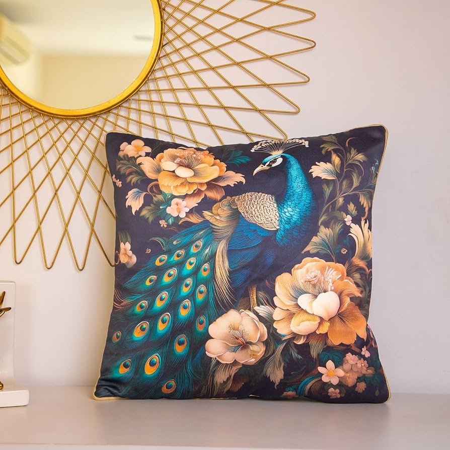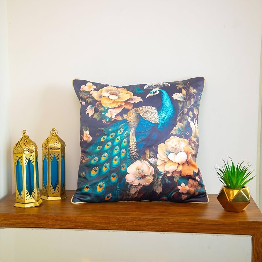Stylish Heritage Boho Peacock Satin Cushion Cover (16×16 inches) ? modern luxury design, durable satin & perfect for sofas, chairs, and beds.