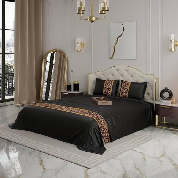 ● Luxurious Charm: Transform your bedroom into an oasis of luxury with the Versailles Vista Grandeur midnight black-coloured satin bed sheet set, a comprehensive bedding ensemble with a bed cover and two perfectly coordinated pillow covers. Crafted from a polyester blend with a 300 TC satin weave, each thread is designed to provide a soft, skin-caressing surface, ensuring unmatched comfort.