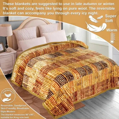 Experience ultimate warmth and comfort with this super soft cloudy printed king-size blanket. Made from high-quality polyester, it offers a cozy, wool-like feel perfect for late autumn and heavy winter nights. This single-ply blanket is breathable, skin-friendly, and reversible, providing two stylish sides to complement your bedroom décor. Measuring 220×230 cm (approx. 90×90 inches) and weighing 3.5 kg, it fits king-size beds perfectly. With well-stitched edges, a formaldehyde-free design, and no unpleasant odors, this blanket is safe, durable, and ideal for keeping your family warm all season long.