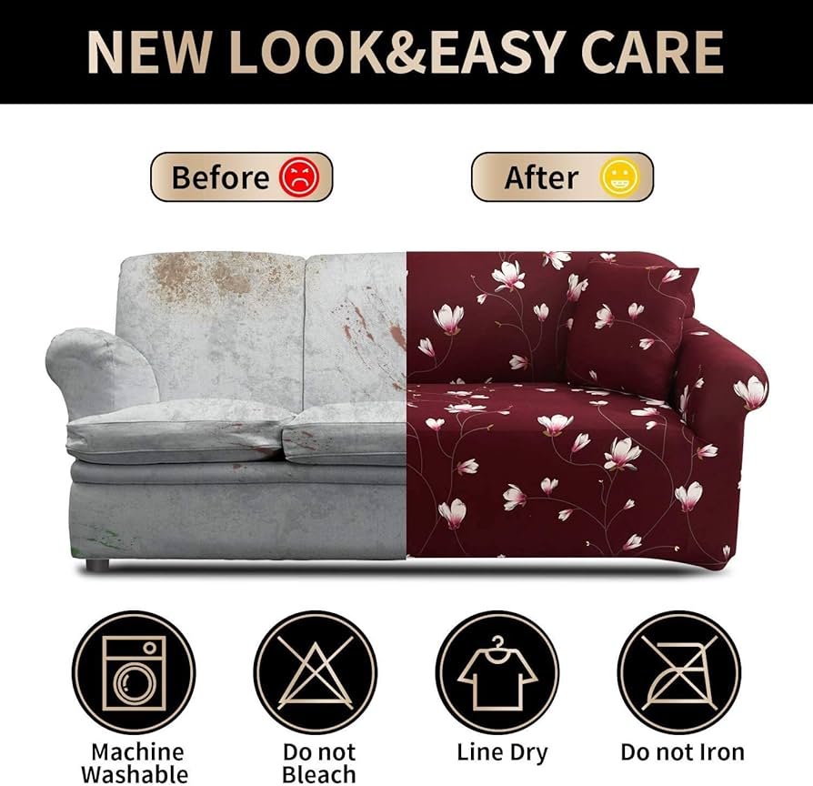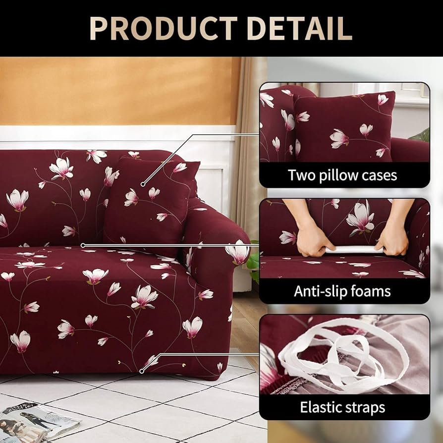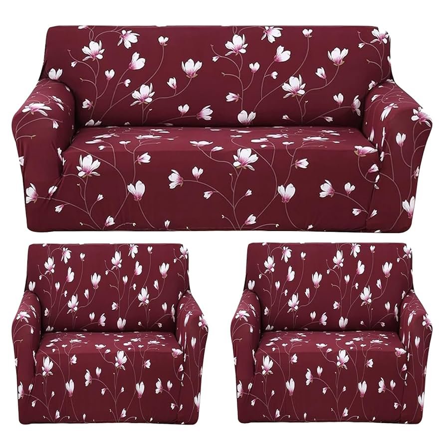Wine Flower Polyester Sofa Cover ? Stretchable, universal 3+1+1 seater fit, modern design, protects from spills and stains. Rs. 500 inclusive of taxes.